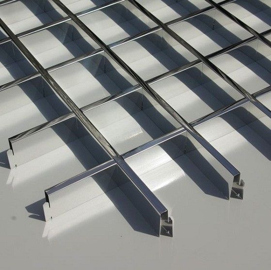 Решетчатый потолок Грильято 150х150 из профиля цвета суперхром создает красивую игру тени и света в разных уровнях освещённости. Это современное декоративное сооружение обладает рядом преимуществ таких как: универсальность, изысканность и практичность, что по праву сделало его популярным решением в интерьерах помещений для бизнеса.